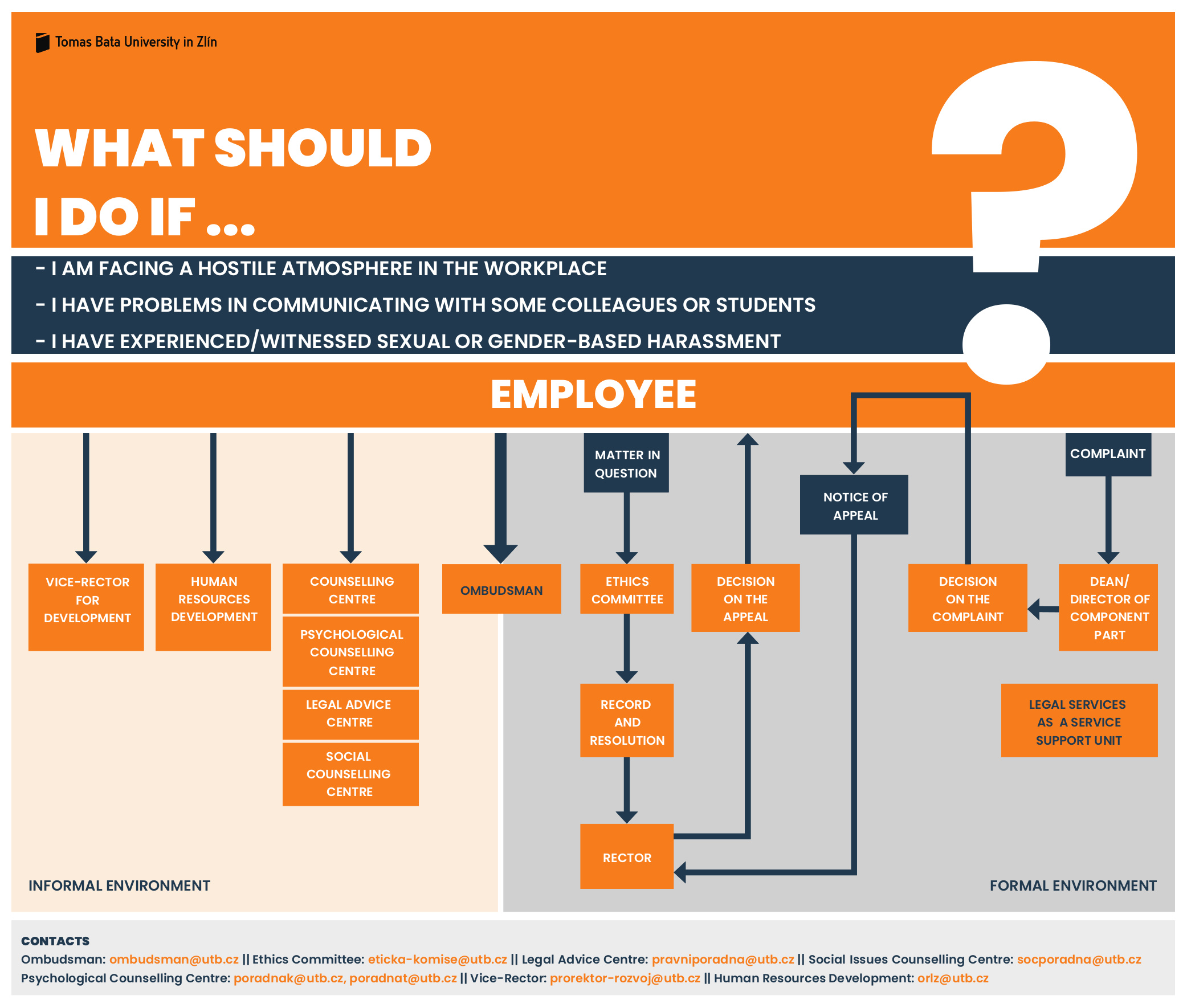 If your problem is related to the observance of principles listed in the TBU Code of Ethics, which is part of our Statute, you can use the official means of communication and contact the Ethics Committee at eticka-komise@utb.cz.